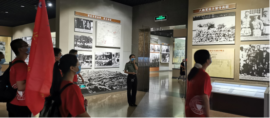 上午9时,实践队员进入八路军抗战史陈列馆(主馆)跟随讲解员学习八路军的历史,从八路军前身的成立到抗战的胜利。大家仔细地观察着陈列展品,讲解员说到:“我们抗日战争的胜利,是八路军和人民群众用小米加步枪实现的伟大成果。”站在局势沙盘周围,实践队员们认真观看革命根据地地图,了解各个根据地的建立和发展历史,同时观看了平型关大捷实景模拟。
