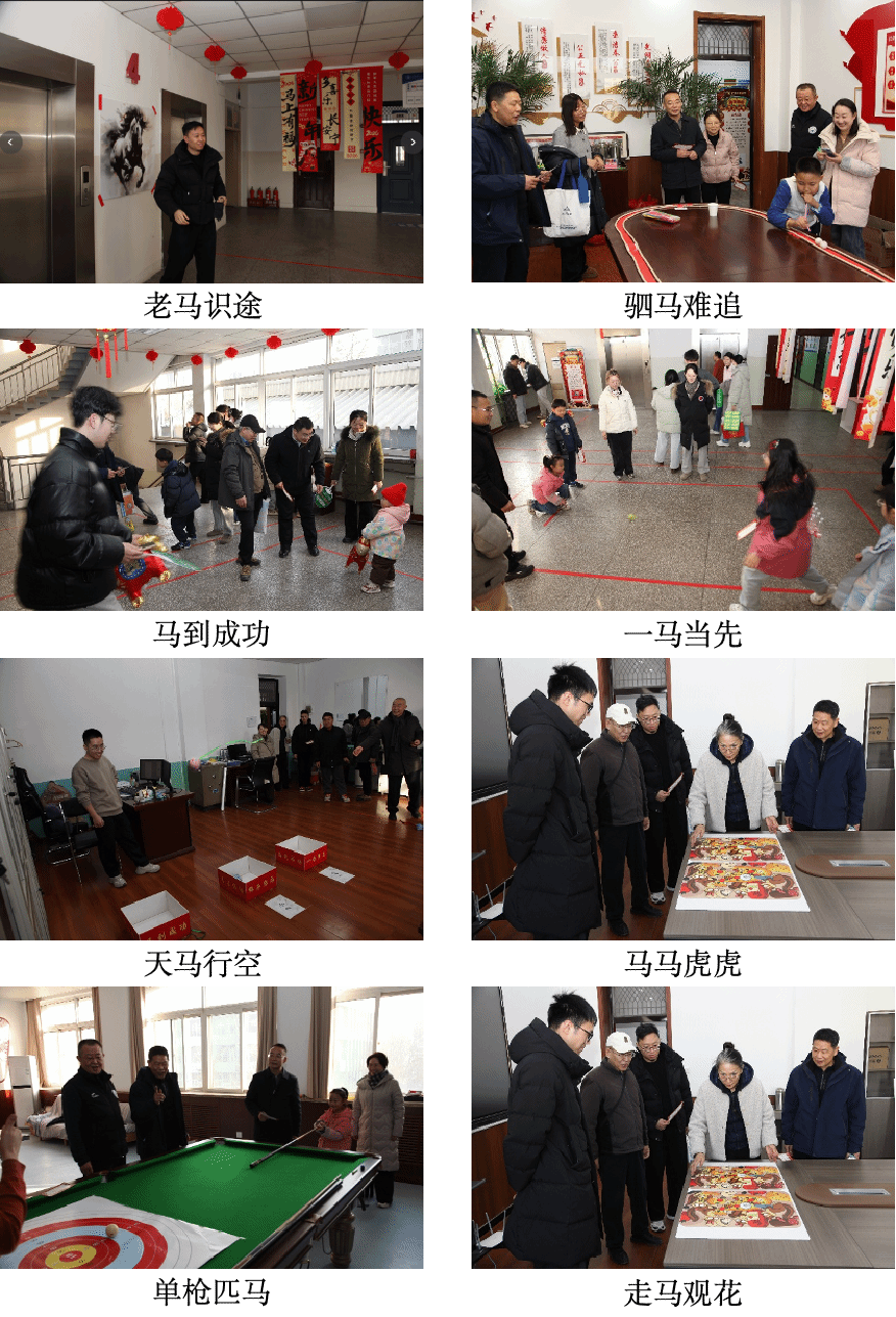 本次活动于下午3点准时开始,持续至5点半结束,活动区域覆盖致明楼二层大厅、三层学院办公区及四层大厅。现场福字高挂、彩带飘扬,一片红火景象,洋溢着浓浓的年味。游园活动以各工会小组为单位承办游戏项目,共设置了八个趣味盎然的游戏关卡,均以“马”为主题设计,创意十足、寓意吉祥。“老马识途”游戏要求参与者蒙眼旋转后摸索前进,精准触摸骏马图案;“一马当先”游戏则是考验投掷技巧,用地滚球击倒矿泉水瓶;“单枪匹马”游戏利用台球案进行击球得分挑战;“驷马难追”游戏需用吸管吹动乒乓球穿越复杂赛道;“天马行空”游戏是投掷马型模具入筐计分;此外还有“马到成功”“走马观花”“马马虎虎”等游戏,分别由采矿、矿加、地工、机关、机电、重点实验室工会小组负责。每个游戏区域都经过精心布置,规则清晰、道具齐全,教职工们踊跃参与,或专注挑战,或欢声鼓励,现场气氛热烈非凡。